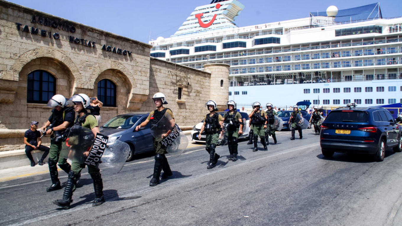 Συγκέντρωση διαμαρτυρίας πραγματοποιείται αυτή την ώρα έξω από το Δικαστικό Μέγαρο Ρόδου, με πολίτες να εκφράζουν τη στήριξή τους στους οκτώ συλληφθέντες της χθεσινής κινητοποίησης στο λιμάνι, κατά την άφιξη του κρουαζιερόπλοιου Crown Iris.