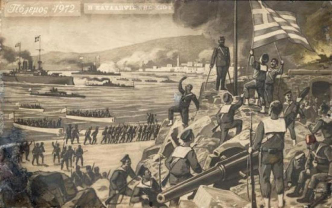 1912 Η Χίος ελευθερώνεται από τον οθωμανικό ζυγό. "Κατελάβομεν την Χίον δια βιαίας αποβιβάσεως την 11η Νοεμβρίου και καταπολεμηθείς ο εις τα όρη αποσυρθείς εχθρός ηναγκάσθη εις την άνευ όρων παράδοσιν του την 20 Δεκεμβρίου 1912", γράφει ο Ν. Δελαγραμμάτικας, Συνταγματάρχης, Διοικητής του ελληνικού στρατού.