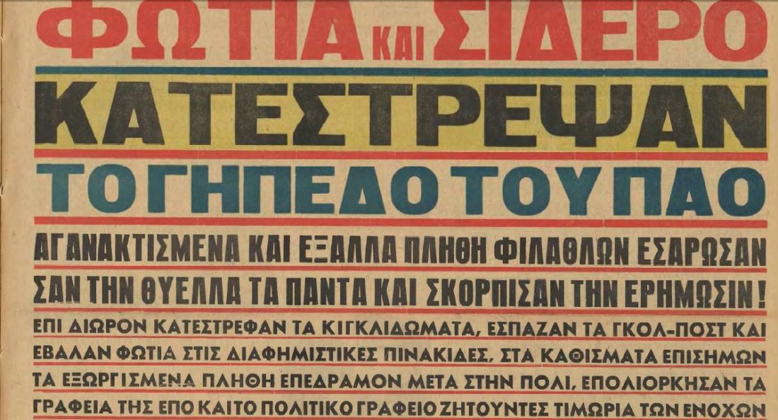 1964 Διακόπτεται στο 115ο λεπτό της παράτασης ο αγώνας Παναθηναϊκού - Ολυμπιακού για το Κύπελλο Ελλάδας. Εξαγριωμένοι φίλαθλοι και των δύο ομάδων, οι οποίοι πιστεύουν ότι ο αγώνας είναι στημένος, καταστρέφουν ολοκληρωτικά το γήπεδο της Λεωφόρου Αλεξάνδρας. Στην κανονική του διάρκεια ο αγώνας είχε λήξει ισόπαλος 1-1 (Δομάζος - Νεοφώτιστος).
