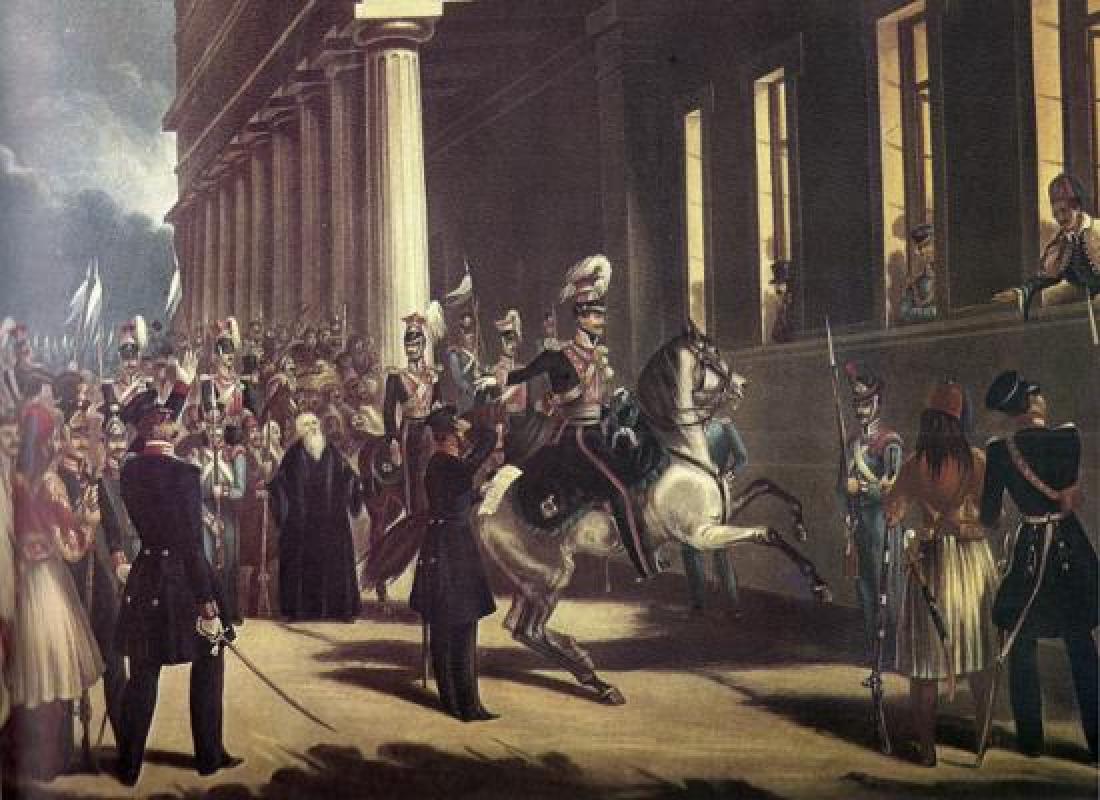 Τότε, ο βασιλιάς αναγκάσθηκε να εμφανισθεί από ένα παράθυρο των Ανακτόρων (το τέταρτο δεξιά των Προπυλαίων της Βουλής, πάνω από το μνημείο του Άγνωστου Στρατιώτη) και να ανοίξει διάλογο με τον έφιππο Καλλέργη, ο οποίος του εξήγησε ότι λαός και στρατός απαιτούν την άμεση σύγκληση Εθνοσυνέλευσης για την κατάρτιση Συντάγματος. Ο βασιλιάς προσπάθησε να κερδίσει χρόνο και υποσχέθηκε την εκπλήρωση του αιτήματος την επομένη. Ο Καλλέργης ήταν ανένδοτος και ζήτησε την άμεση αποδοχή του αιτήματος, ενώ αξίωσε ακόμη την παραίτηση της κυβέρνησης και τον σχηματισμό κυβέρνησης που θα απολάμβανε την εμπιστοσύνης του λαού και την αποπομπή των Βαυαρών από τη δημόσια διοίκηση, εκτός των αποδεδειγμένα φιλελλήνων.