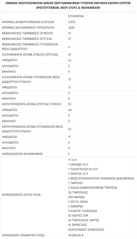 Συγκεκριμένα, από τις 16 Δεκεμβρίου 2023 έως τις 7 Ιανουαρίου 2024 διενεργήθηκαν συνολικά 3.530 έλεγχοι, εξαρθρώθηκαν 37 παράνομα μίνι καζίνο και αποκαλύφθηκαν 4 υποθέσεις συμμετοχής σε παράνομα τυχερά παιχνίδια μέσω του διαδικτύου.