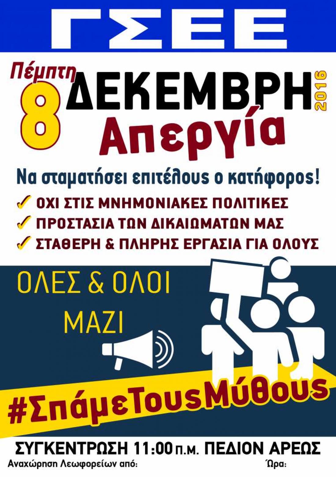 Η απεργιακή συγκέντρωση των ΓΣΕΕ - ΑΔΕΔΥ στην Αθήνα θα πραγματοποιηθεί την Πέμπτη, 8 Δεκεμβρίου 2016 και ώρα 11:00πμ, στο Πεδίον του Άρεως.