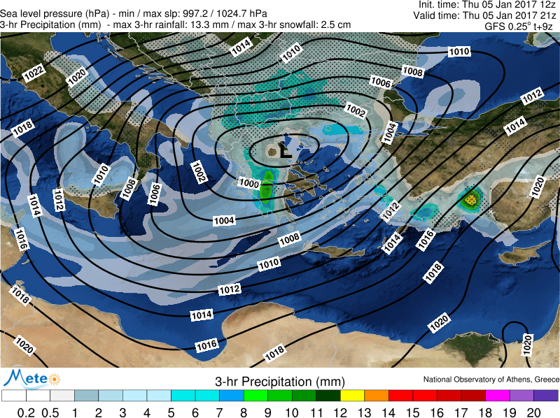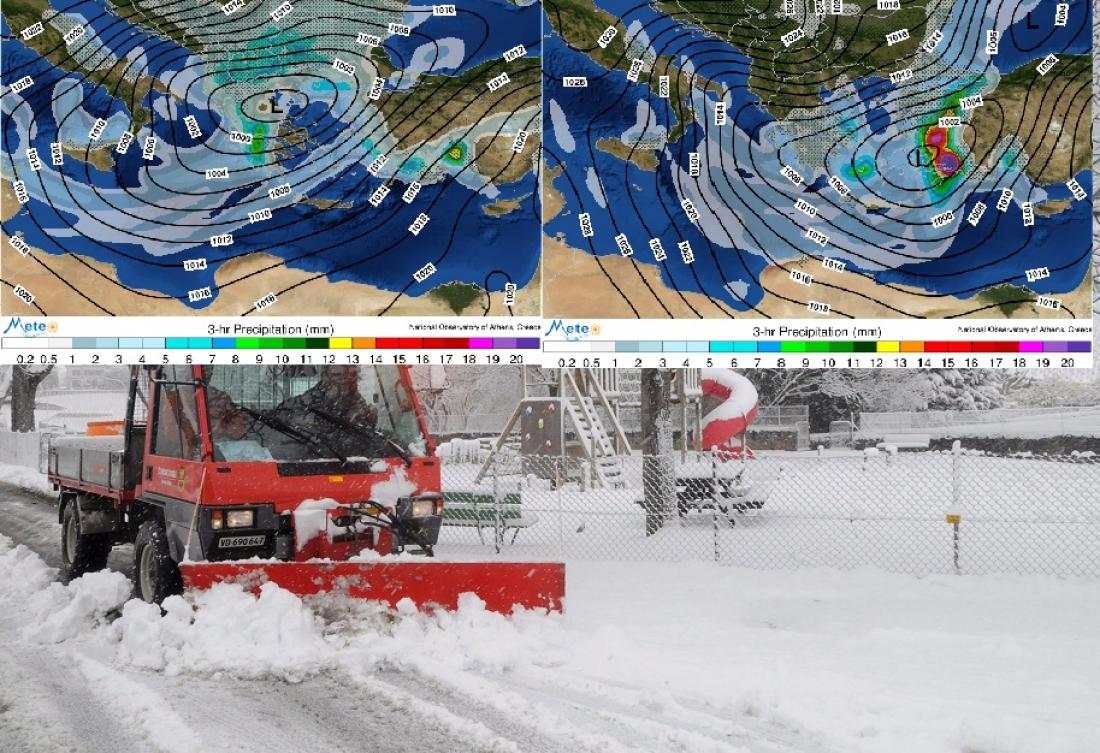 Στη συνέχεια και έως το μεσημέρι θα σημειωθούν χιονοπτώσεις στα ορεινά, χιονόνερο ή χιόνι στα ημιορεινά και βροχοπτώσεις στα πεδινά της Ηπείρου, της δυτικής Μακεδονίας, της δυτικής και κεντρικής Στερεάς, και της Πελοποννήσου. Βροχές θα σημειωθούν στο ανατολικό, κεντρικό και νότιο Αιγαίο (εκτός Δωδεκανήσων), ενώ όμβροι ή καταιγίδες θα σημειωθούν κυρίως στο ανατολικό Αιγαίο και την ορεινή Κρήτη. Στη συνέχεια και έως το τέλος του 24ώρου τα φαινόμενα θα περιοριστούν κυρίως στην κεντρική και νότια χώρα. Βροχές θα σημειωθούν στα πεδινά και χιονοπτώσεις ή χιονόνερο στα ορεινά και ημιορεινά της Στερεάς, της Πελοποννήσου και του νοτίου Ιονίου, ενώ όμβροι ή καταιγίδες κατά τόπους ισχυρές, αναμένονται στο κεντρικό και νότιο Αιγαίο. Παγετός θα σημειωθεί στα ορεινά της κεντρικής και βόρειας χώρας, καθώς και στα ορεινά της υπόλοιπης χώρας και τα πεδινά της Ηπείρου, της Μακεδονίας και της Θεσσαλίας προς το τέλος του εικοσιτετραώρου. Οι άνεμοι στο Αιγαίο θα φτάνουν τοπικά τα 9 μποφόρ.