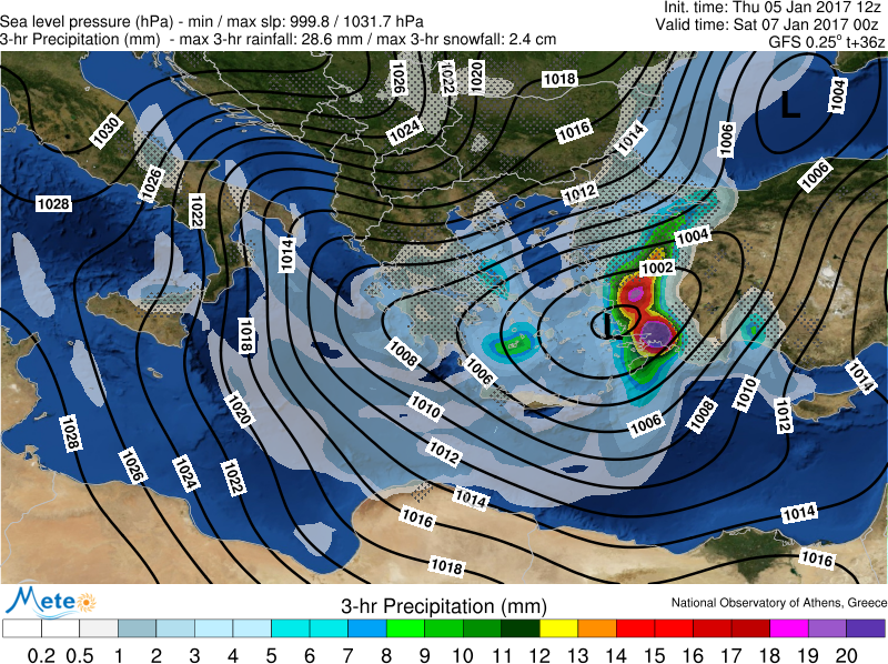 Την Παρασκευή 06/01 ο καιρός θα είναι άστατος στο μεγαλύτερο μέρος της χώρας. Τις πρωινές ώρες το κύριο χαρακτηριστικό θα είναι οι ισχυρές βροχοπτώσεις και καταιγίδες στα νησιά του Ανατολικού Αιγαίου, στα Δωδεκάνησα και στην Κρήτη με μεγάλη πιθανότητα εκδήλωσης πλημμυρικών επεισοδίων. Στα βόρεια και κεντρικά ηπειρωτικά τμήματα θα υπάρχουν αραιές νεφώσεις με μικρή πιθανότητα ασθενών χιονοπτώσεων στη Θράκη, στη Δυτική Μακεδονία και μεγάλα διαστήματα με ηλιοφάνεια στη Θεσσαλία και στη Στερεά, καθώς οι άνεμοι θα στραφούν σε ισχυρούς βορειοδυτικούς. Στην Πελ/νησο θα σημειώνονται ασθενείς χιονοπτώσεις στα ορεινά και παροδικές βροχοπτώσεις ή χιονόνερο στα πεδινά. Τις απογευματινές και βραδινές ώρες (Χάρτης 2) η θερμοκρασία θα παρουσιάσει περαιτέρω πτώση σε όλη τη χώρα και οι χιονοπτώσεις θα εντοπίζονται, σε πεδινές περιοχές της Χαλκιδικής, της Θεσσαλίας, της Στερεάς, της Εύβοιας και σε πολύ χαμηλά υψόμετρα στην Πελ/νησο (100 μ στα βορειότερα τμήματα, 300 μ στα νοτιότερα). Χιονοπτώσεις αναμένονται τις βραδυνές ώρες και στην Αττική.