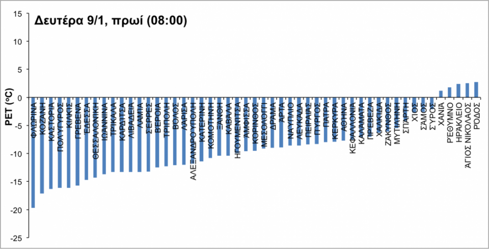 Η θερμοκρασία στην Θράκη και την ανατολική Μακεδονία θα κυμανθεί από -2 έως 12 βαθμούς, στην υπόλοιπη Μακεδονία -12 έως 7, στην Ήπειρο και τη δυτική Στερεά από -5 έως 7, στη Θεσσαλία και την κεντρική Στερεά από -3 έως 9, στην ανατολική Στερεά και την Πελοπόννησο από 0 έως 14, στα νησιά του Ιονίου από 0 έως 8, στα νησιά του βορείου Αιγαίου από 1 έως 14, και στα νησιά του υπολοίπου Αιγαίου από 7 έως 16. Σημειώνεται ότι οι ελάχιστες θερμοκρασίες θα σημειωθούν στο τέλος του εικοσιτετραώρου.