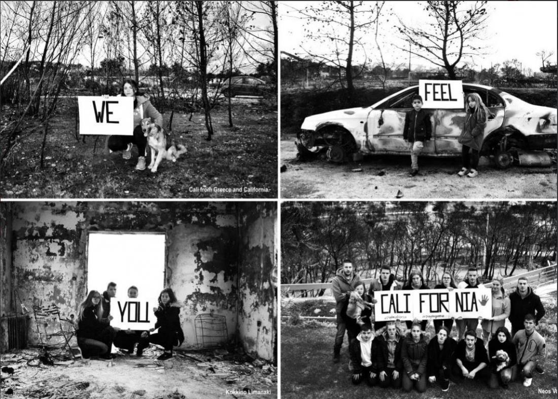 «Σε νιώθουμε Καλιφόρνια». Αυτό είναι το συγκλονιστικό μήνυμα που στέλνουν οι νέοι από το Μάτι στην Καλιφόρνια, η οποία ζει τον πύρινο εφιάλτη και θρηνεί δεκάδες νεκρούς και αναζητά μέσα σε στάχτες περισσότερους από χίλιους ανθρώπους..