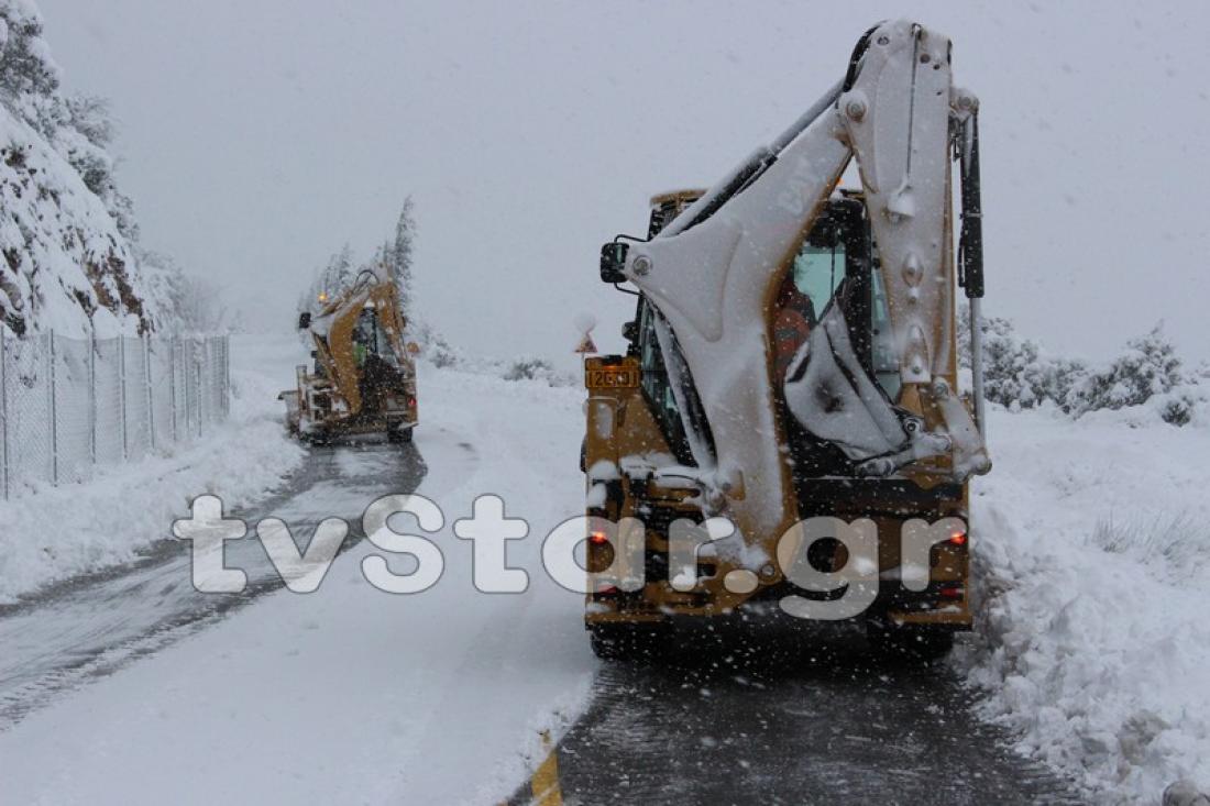 Περισσότερες από 3 ώρες χρειάστηκαν τα εκχιονιστικά μηχανήματα να απομακρύνουν το χιόνι που έπεφτε πυκνό και να ρίχνουν συνεχώς αλάτι για να κρατήσουν ανοιχτό το εθνικό δίκτυο, καθώς η χιονόπτωση είχε ιδιαίτερα μεγάλη ένταση και σχηματιζόταν παγετός σχεδόν αμέσως, αφού η θερμοκρασία έφτασε τους 3 βαθμούς κάτω από το μηδέν.