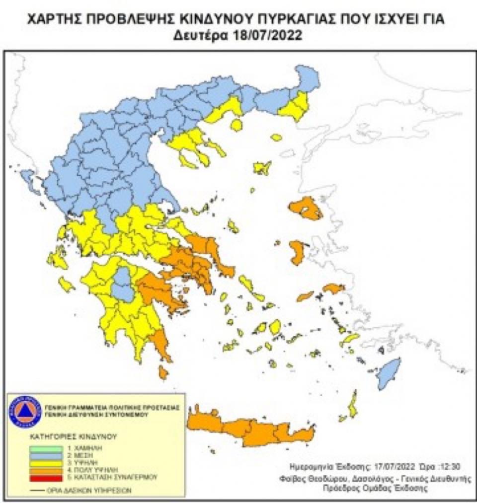 Πολύ υψηλός κίνδυνος πυρκαγιάς (κατηγορίας 4) προβλέπεται από την Γενική Γραμματεία Πολιτικής Προστασίας για την Δευτέρα 18 Ιουλίου, στις περιοχές:
