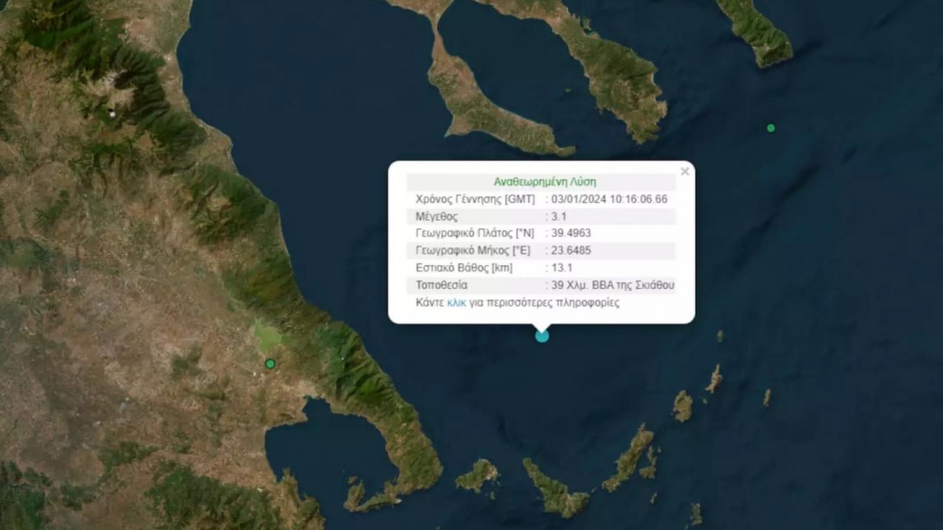Σεισμός 3,1 Ρίχτερ σημειώθηκε στις Σποράδες λίγο μετά τις 12:00 το μεσημέρι της Τετάρτης (03.01.2024).