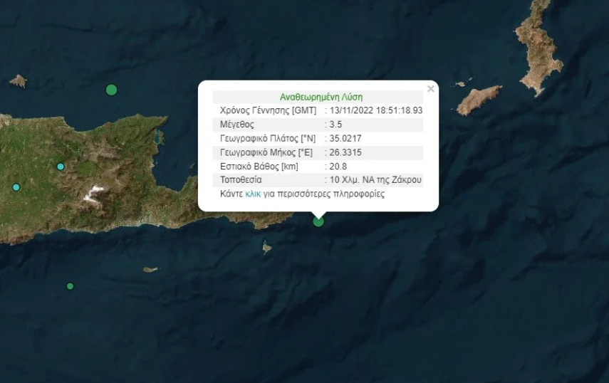 Το επίκεντρο του σεισμού εντοπίστηκε σε θαλάσσια περιοχή, 10 χιλιόμετρα νοτιοανατολικά της Ζάκρου, ενώ το εστιακό βάθος του εκτιμήθηκε στα 20 χιλιόμετρα, σύμφωνα με το γεωδυναμικό ινστιτούτο.