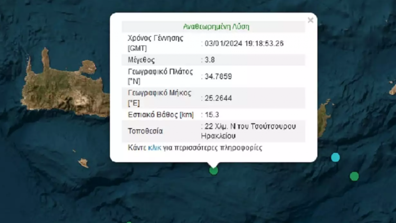 Σεισμός σημειώθηκε το βράδυ της Τετάρτης (03/01/2024) στη θαλάσσια περιοχή κάτω από Ηράκλειο στην Κρήτη και έγινε αισθητός στις νότιες περιοχές του νησιού.