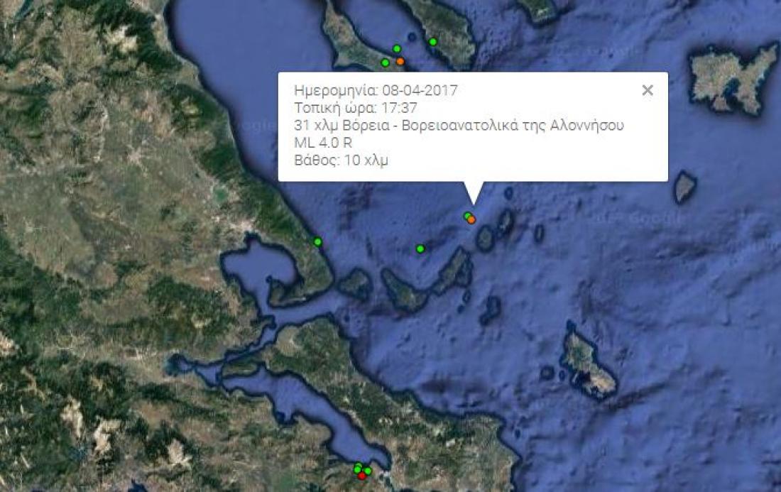 Σεισμική δόνηση μεγέθους 4 βαθμών της κλίμακας Ρίχτερ σημειώθηκε λίγο μετά τις 17.37 το απόγευμα στη θαλάσσια περιοχή βορειοανατολικά της Αλοννήσου.