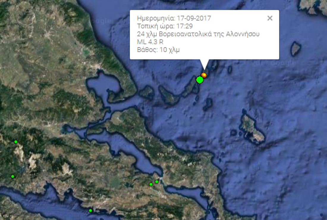 Ασθενή χαρακτηρίζει το Γεωδυναμικό Ινστιτούτο Αθηνών την σεισμική δόνηση με τελική μέτρηση 4,1 βαθμών της κλίμακας Ρίχτερ που σημειώθηκε περίπου μισή ώρα μετά τις 5 το απόγευμα στην Αλόννησο.