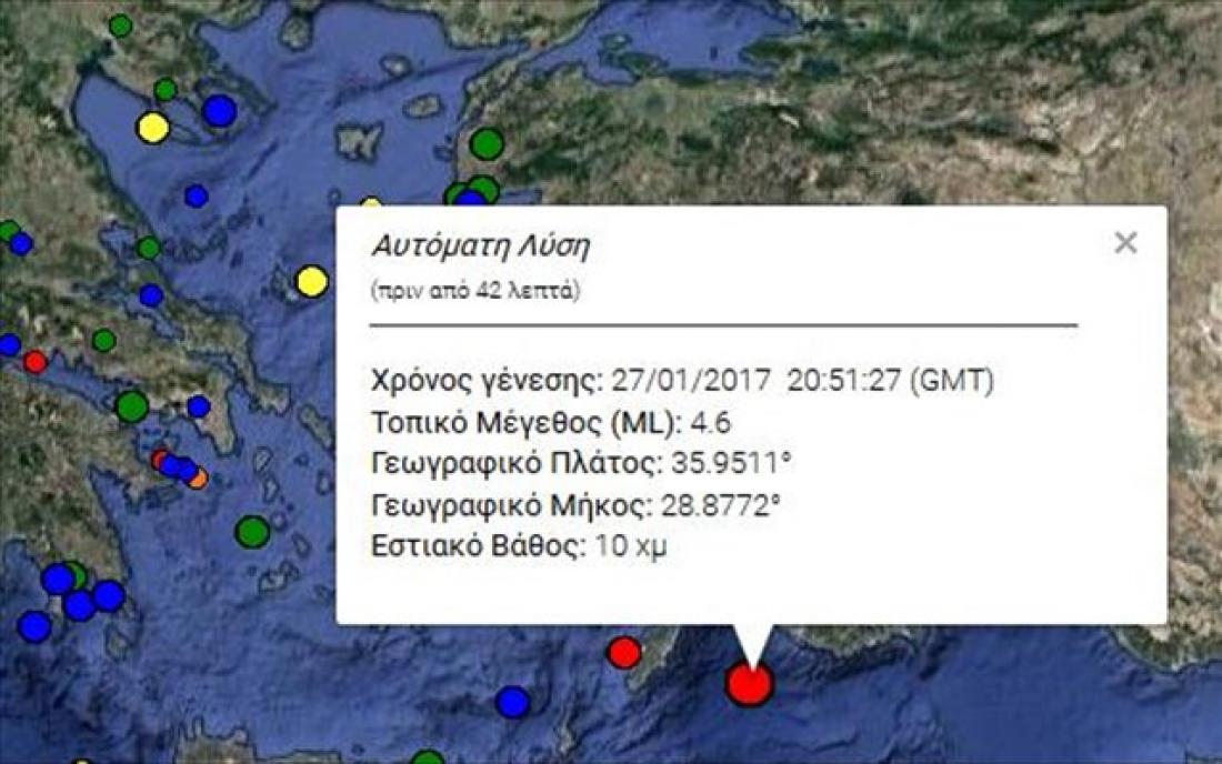 Σεισμική δόνηση μεγέθους 4,6 βαθμών της κλίμακας Ρίχτερ σημειώθηκε στις 22.51 την Παρασκευή στον θαλάσσιο χώρο μεταξύ Ρόδου και Καστελόριζου, σύμφωνα με εκτίμηση του Γεωδυναμικού Ινστιτούτου του Εθνικού Αστεροσκοπείου Αθηνών.
