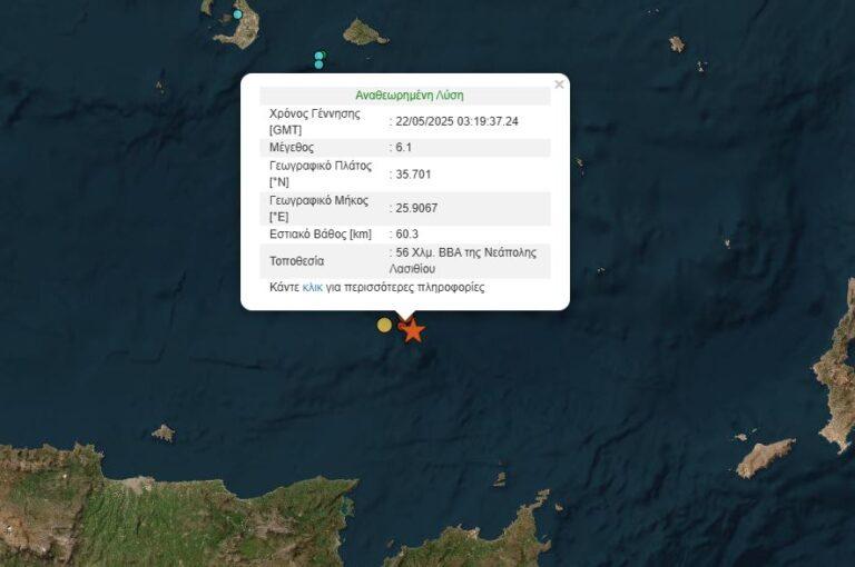 Καθησυχαστικοί εμφανίζονται οι σεισμολόγοι για την σεισμική δόνηση μεγέθους 6,1 βαθμών της κλίμακας Ρίχτερ που σημειώθηκε στις 06:19 στα ανοιχτά της Κρήτης. Οι ειδικοί κάνουν λόγο για έναν τυπικό σεισμό ενδιάμεσου βάθους, ο οποίος δεν αναμένεται να φέρει πλούσια ακολουθία.