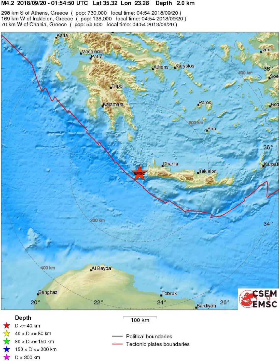 Σεισμός τώρα: Σεισμική δόνηση μεγέθους 4,2 βαθμών της κλίμακας Ρίχτερ, σύμφωνα με Ευρωπαϊκό - Μεσογειακό Σεισμολογικό Κέντρο (EMSC), σημειώθηκε τα ξημερώματα της Πέμπτης (20/9), στις 04:54 σε υποθαλάσσια περιοχή δυτικά της Κρήτης.