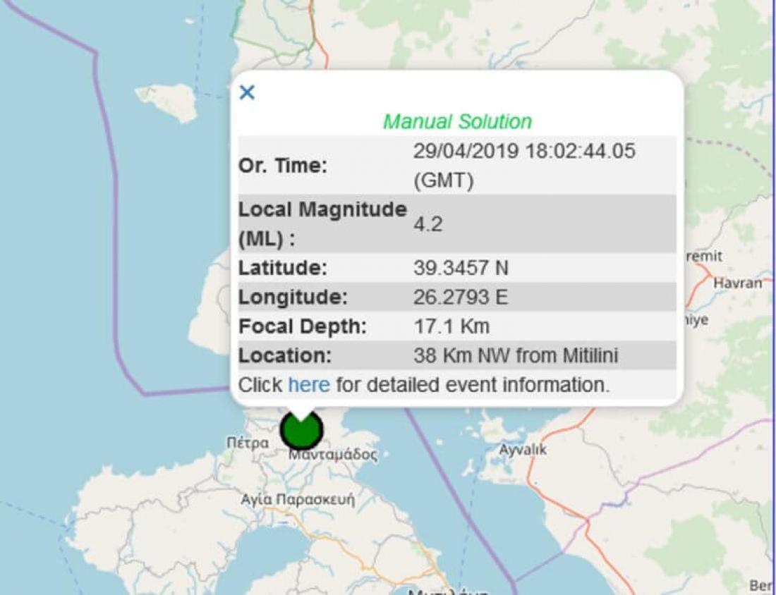 Σύμφωνα με την αναθεωρημένη λύση του Γεωδυναμικού Ινστιτούτου, ο ήταν 4,2 ρίχτερ και το επίκεντρο του σεισμού ήταν 38 χιλιόμετρα από τη Μυτιλήνη , με το εστιακό βάθος στα 17,1 χιλιόμετρα.