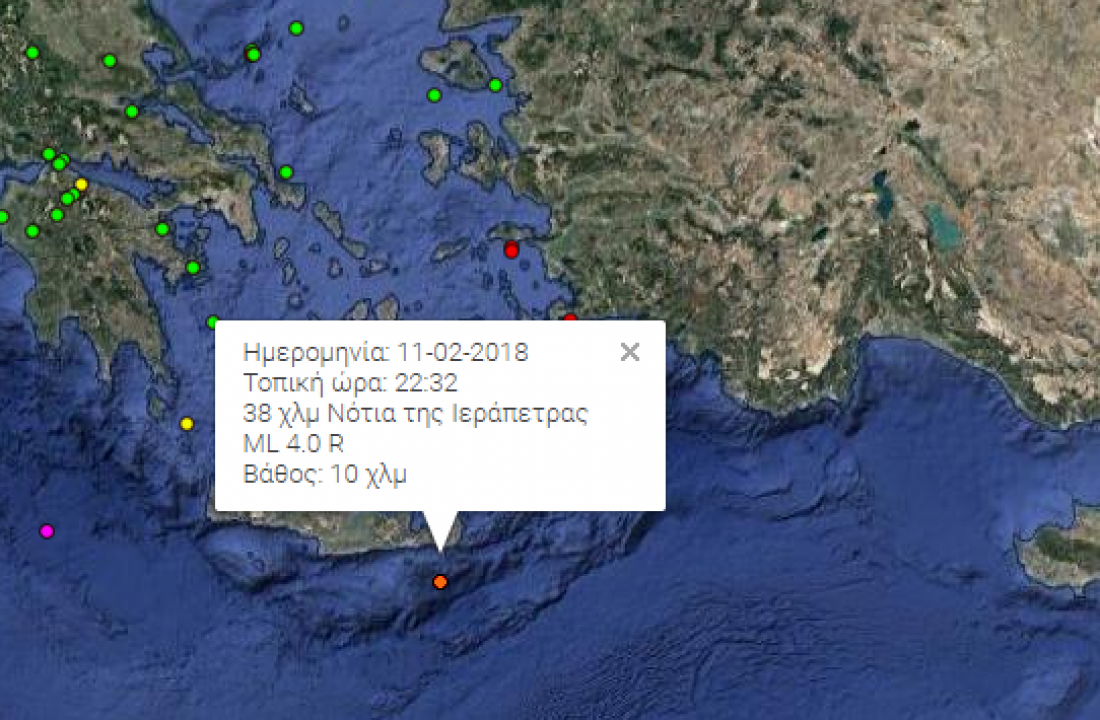 Απόψε (11/2) λίγο στις 10 και μισή το βράδυ, μια νέα σεισμική δόνηση 4,0 βαθμών της κλίμακας Ρίχτερ, έγινε αισθητή στη Νότια Κρήτη, 38 χιλιόμετρα Νότια της Ιεράπετρας με εστιακό βάθος μόλις 10 χιλιόμετρα.