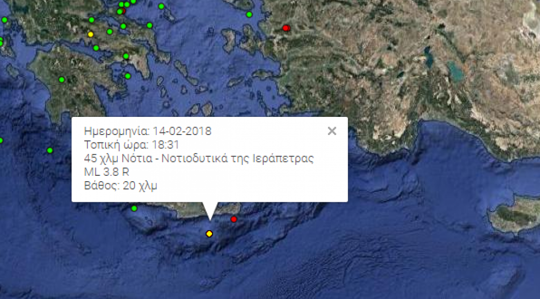 Αυτή τη φορά η σεισμική δόνηση σημειώθηκε λίγο μετά τις 6 και μισή το απόγευμα της Τετάρτης (14/2) και είχε επίκεντρο 45 χιλιόμετρα Νότια-Νοτιοδυτικά της Ιεράπετρας με εστιακό βάθος 20 χιλιομέτρων, κάτι που συντέλεσε στο γεγονός ότι δεν έγινε πολύ αισθητός.