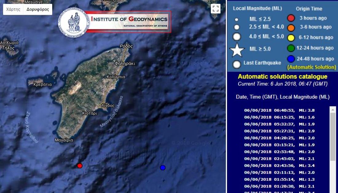 Σεισμός τώρα : Σεισμική δόνηση 3,8 Ρίχτερ εκδηλώθηκε στις 9:40 το πρωί της Τετάρτης στη θαλάσσια περιοχή νότια της Ρόδου.