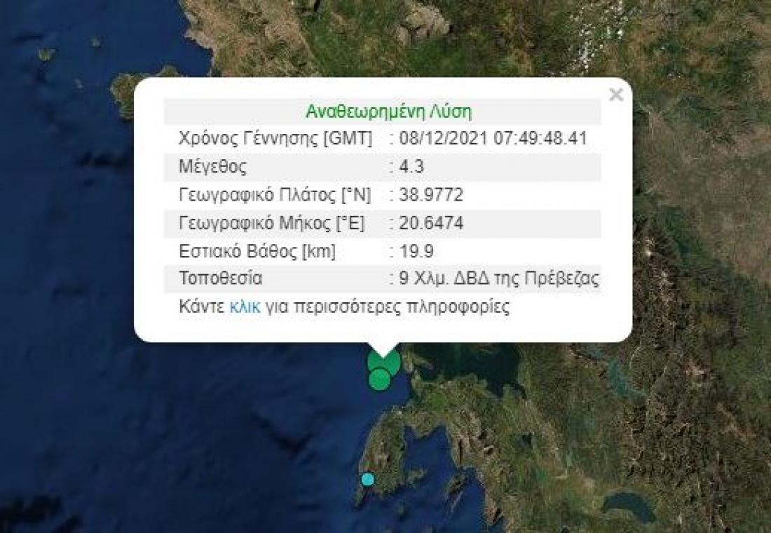 Σεισμός τώρα: Σεισμική δόνηση μεγέθους 4,3 βαθμών της κλίμακας Ρίχτερ, σημειώθηκε πριν λίγη ώρα στην Πρέβεζα.