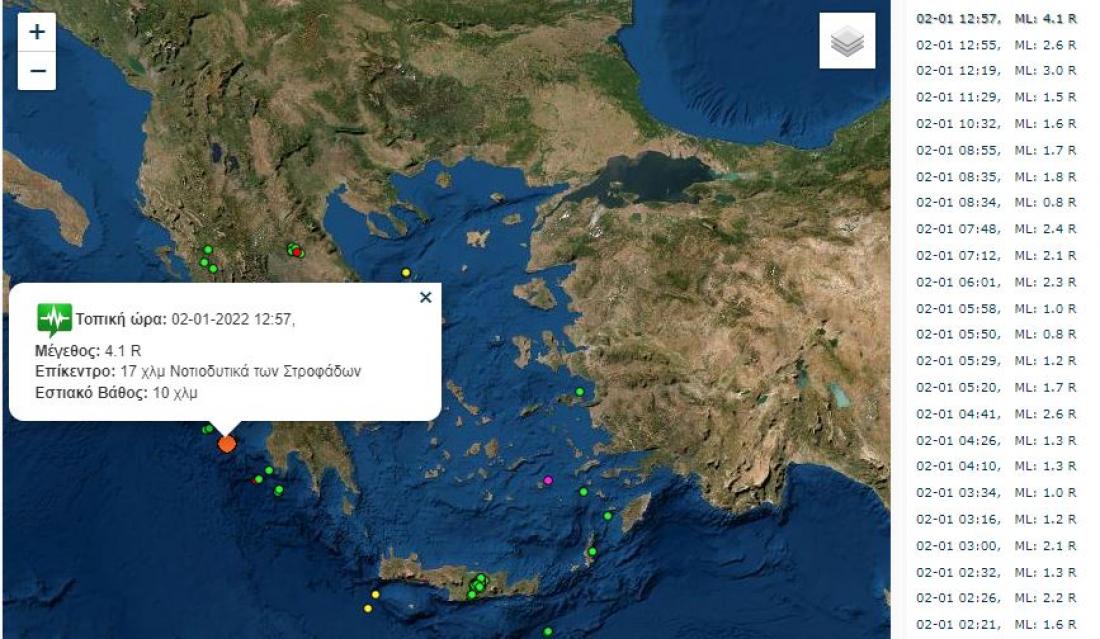 Σεισμός τώρα: Σεισμική δόνηση 4,1 Ρίχτερ 17 χιλιόμετρα νοτιοδυτικά των Στροφάδων, με εστιακό βάθος 10 χιλιόμετρα.