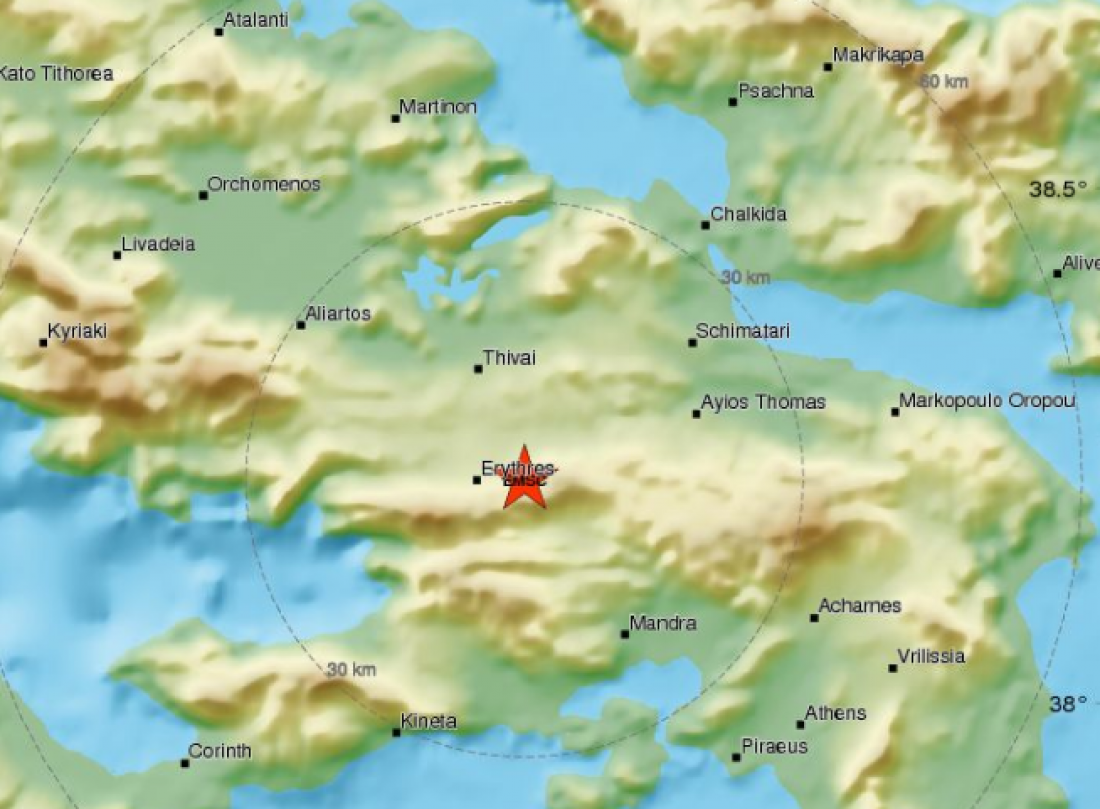 Σύμφωνα με το emsc, ο σεισμός ήταν μεγέθους 3,5 βαθμών της κλίμακας Ρίχτερ και σημειώθηκε μερικά λεπτά μετά τις 4 το απόγευμα με επίκεντρο κοντά στις Ερυθρές, 40 χιλιόμετρα ΒΑ των Αθηνών