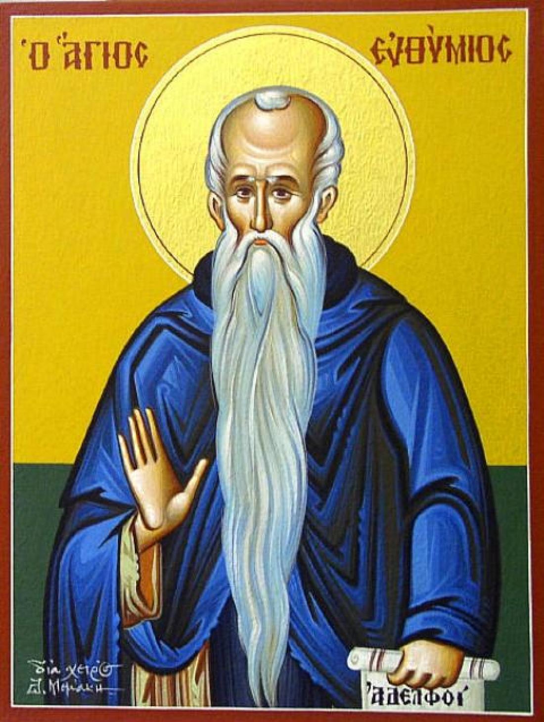 Τὰς φροντίδας τοῦ βίου ἀπαρνησάμενος, καὶ Ἀγγέλων τὸν βίον ἀναλαβόμενος, ἐγκρατείᾳ τὴν ψυχὴν κατελάμπρυνας· καὶ θαυμάτων ἐκ Θεοῦ, χάριν ἐδέξω δαψιλῶς, Εὐθύμιε θεοφόρε, ὑπὲρ ἡμῶν ἱκετεύων, τῶν εὐσεβῶς εὐφημούντων σε.