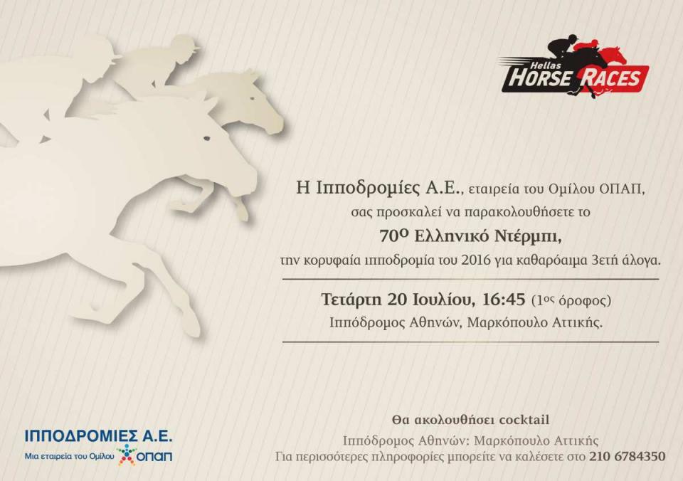 Όλα είναι έτοιμα στο Μαρκόπουλο για τη μεγάλη ημέρα σήμερα στον Ιππόδρομο. Το 70ο ελληνικό ντέρμπι, η κορυφαία ιπποδρομία της χρονιάς, με τα καλύτερα καθαρόαιμα ελληνικά άλογα, υπόσχεται θέαμα υψηλού επιπέδου και ισχυρές δόσεις αδρεναλίνης στους λάτρεις του αγωνίσματος.
