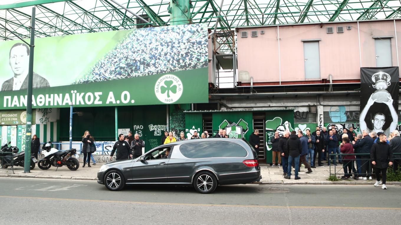 Η σορός του μεταφέρθηκε έξω από το γήπεδο της Λεωφόρου για μια τελευταία στάση λίγων λεπτών. Από τα μεγάφωνα του «Απόστολος Νικολαΐδης» ακουγόταν ο ύμνος του Παναθηναϊκού, ενώ στο μάτριξ βρισκόταν η εικόνα του «Στρατηγού».