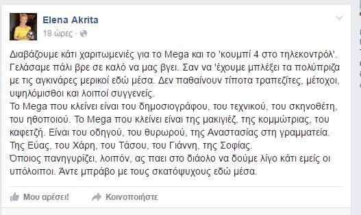 Η Ελενα Ακρίτα δε δίστασε να διαολοστείλει, με ανάρτησή της στο fb, τους «σκατόψυχους», όπως τους χαρακτηρίζει, που χαίρονται αδιαφορώντας που τόσοι εργαζόμενοι χάνουν τη δουλειά τους.