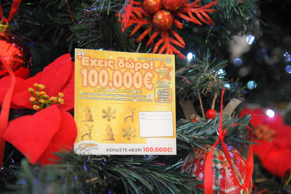 Το παιχνίδι «ΕΧΕΙΣ ΔΩΡΟ! 100.000€» κοστίζει 2 ευρώ και μοιράζει κέρδη έως και 100.000 ευρώ. Στη μέση του λαχνού υπάρχει μια ειδική τσάκιση, ώστε να μπορεί να τοποθετηθεί ως διακοσμητικό ή σαν στολίδι στο δέντρο. Διαθέτει, επίσης, ειδική περιοχή για ευχές.