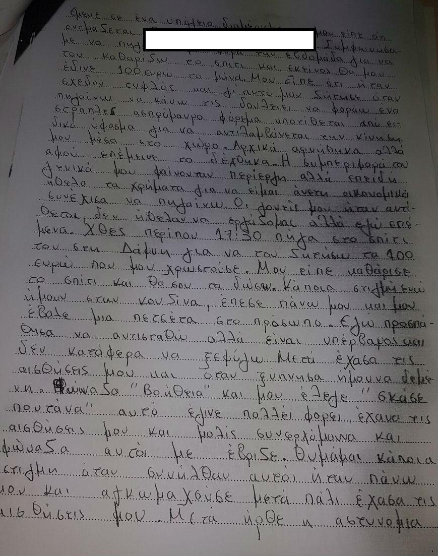 Μετά έχασα τις αισθήσεις μου και όταν ξύπνησα ήμουν δεμένη. Φώναζα "βοήθεια" και μου έλεγε "σκάσε πουτ@ν@. Αυτό συνέβη πολλές φορές, έχανα τις αισθήσεις μου και όταν συνερχόμουν και φώναζα βοήθεια, αυτός με έβριζε. Θυμάμαι κάποια στιγμή όταν συνήλθα αυτός ήταν πάνω μου και αγκομαχούσε».