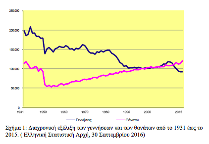 Στο σχεδιάγραμμα η διαχρονική εξέλιξη των γεννήσεων και των θανάτων από το 1931 έως το 2015. ( Ελληνική Στατιστική Αρχή, 30 Σεπτεμβρίου 2016).