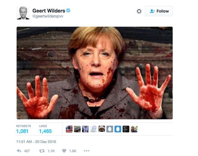 Ο Ολλανδός πολιτικός, βουλευτής και αρχηγός του αντι-Ισλαμικού κόμματος «Partij voor de Vrijheid», Γκερτ Βίλντερς, σε μήνυμά του στο Twitter έδωσε τη σοκαριστική φωτογραφία όπου η Μέρκελ εμφανίζεται βουτηγμένη στο αίμα.