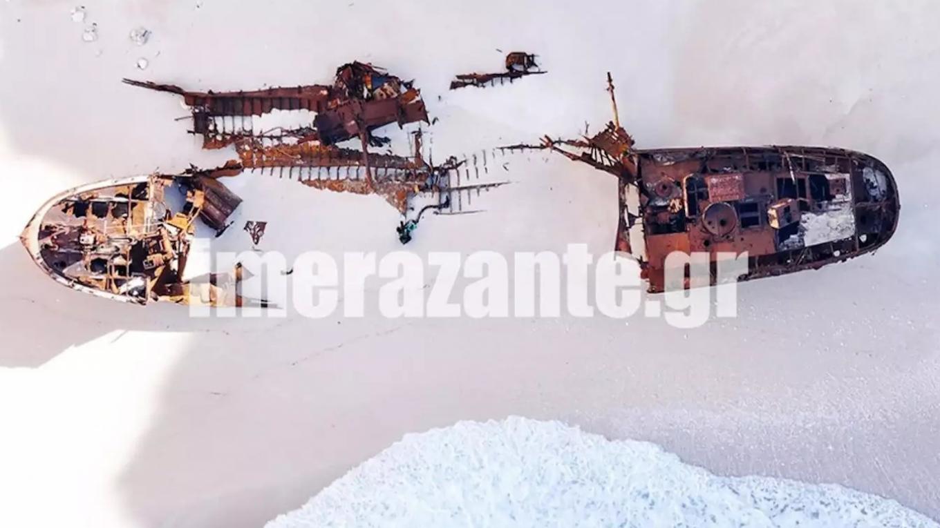 Τα βίντεο που αναρτήθηκαν από το “ναύγιο” δείχνουν σχεδόν κομμένο στη μέση το σκαρί, θαμμένο στην άμμο.
