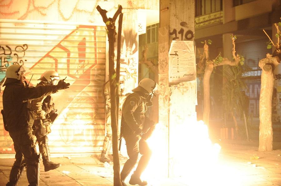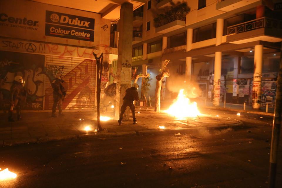 Οι διαδηλωτές απωθήθηκαν όλοι προς την Ομόνοια, ενώ όσοι κατευθύνθηκαν προς την οδό Πατησίων και τα Εξάρχεια έβαλαν φωτιές σε κάδους. Κατά την υποχώρηση νεαρών προς τα Εξάρχεια, χαμηλά στην Πανεπιστημίου, συνελήφθησαν τρεις νεαροί. Τα επεισόδια μεταφέρθηκαν στην οδό Στουρνάρη και τους δρόμους γύρω από το Πολυτεχνείο, όπου έχουν στηθεί πύρινα οδοφράγματα και γίνονται συνεχείς συμπλοκές με βόμβες μολότοφ, πέτρες, δακρυγόνα και χειροβομβίδες κρότου-λάμψης. Περισσότεροι από 100 αντιεξουσιαστές έχουν ταμπουρωθεί στο Πολυτεχνείο και δεκάδες άλλοι έχουν στήσει οδοφράγματα έξω από αυτό και συγκρούονται με τα ΜΑΤ στις οδού Τοσίτσα, Στουρνάρη και Πατησίων.