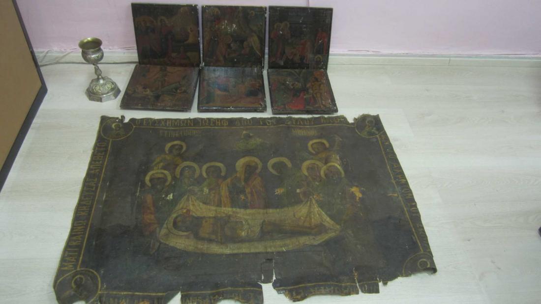 Στην κατοχή του συλληφθέντα βρέθηκαν, μέσα σε σάκο, κλεμμένα θρησκευτικά αντικείμενα (έξι εικόνες, ένας παλαιός Επιτάφιος και ένα μεταλλικό δισκοπότηρο), τα οποία αφού επιδείχθηκαν σε αρχαιολόγο, κρίθηκαν ότι εμπίπτουν στις προστατευτικές διατάξεις της νομοθεσίας «για την Προστασία των Αρχαιοτήτων και εν γένει της Πολιτιστικής Κληρονομιάς» καθώς και άλλα κλοπιμαία, κινητά τηλέφωνα και οκτώ κροτίδες.