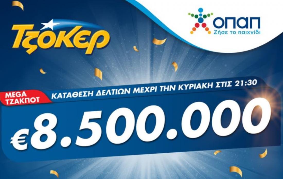 Η μεγάλη κλήρωση του ΤΖΟΚΕΡ για τα 8,5 εκατομμύρια ευρώ θα πραγματοποιηθεί στις 22:00. Οι παίκτες μπορούν να την παρακολουθήσουν ζωντανά μέσα από το Facebook, στο κανάλι του ΟΠΑΠ στο , στο tzoker.gr και στην εφαρμογή ΤΖΟΚΕΡ.