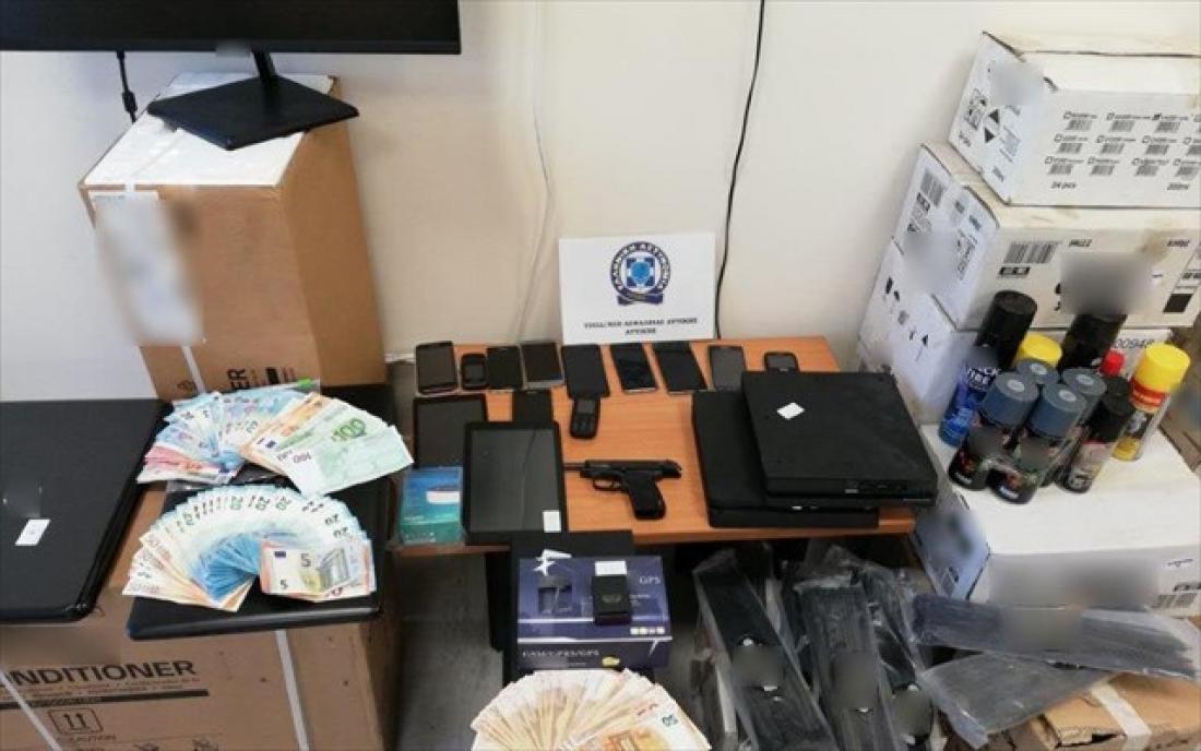 Κατά τις έρευνες σε σπίτια, γραφεία και λοιπούς χώρους, βρέθηκαν μεταξύ άλλων και κατασχέθηκαν τρία αυτοκίνητα, τράκτορας, πλαστές πινακίδες κυκλοφορίας, δύο «εγκέφαλοι» οχημάτων, δύο πιστόλια, 24 φυσίγγια, σιδερογροθιά, μαχαίρι κυνηγετικού τύπου, 49.272 ευρώ, δύο συστήματα δορυφορικού εντοπισμού (GPS), πλήθος ηλεκτρονικών συσκευών και τιμαλφών, έγγραφα, τιμολόγια, μπλοκ επιταγών, βιβλιάρια καταθέσεων, τραπεζικά έγγραφα και σφραγίδες διαφόρων εταιρειών, 127 προϊόντα εταιρείας ηλεκτρονικής τεχνολογίας (φορητοί υπολογιστές, οθόνες κλπ), 33 κινητά τηλέφωνα, τέσσερα tabletς, τρεις φορητοί υπολογιστές, καθώς και 4.649 φιάλες οινοπνευματώδους ποτού.