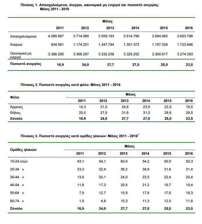 Το εποχικά διορθωµένο ποσοστό ανεργίας τον Μάιο του 2016 ανήλθε σε 23,5% έναντι 25,0% τον Μάιο του 2015 και έναντι του αναθεωρηµένου προς τα άνω 23,5% τον Απρίλιο του 2016. Το σύνολο των απασχολουµένων, κατά τον Μάιο του 2016, εκτιµάται ότι ανήλθε σε 3.653.788 άτοµα.