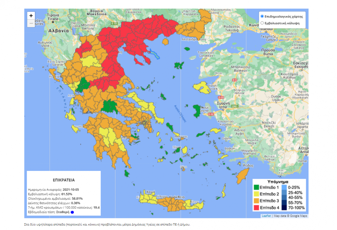 Όπως φαίνεται στον επιδημιολογικό χάρτη, Σέρρες και Καρδίτσα είναι οι νομοί που τώρα πέρασαν κι επίσημα στο «κόκκινο».