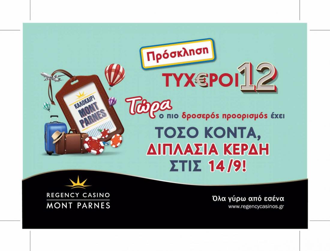 Οι προωθητικές ενέργειες που πραγματοποιούνται στο Regency Casino Mont Parnes τη περίοδο αυτή, θα διαρκέσουν έως τις 18 Σεπτεμβρίου. 12 Τυχεροί την εβδομάδα, 18.000€ απευθείας μετρητά με κληρώσεις κάθε Δευτέρα, Τετάρτη, Παρασκευή και Κυριακή.