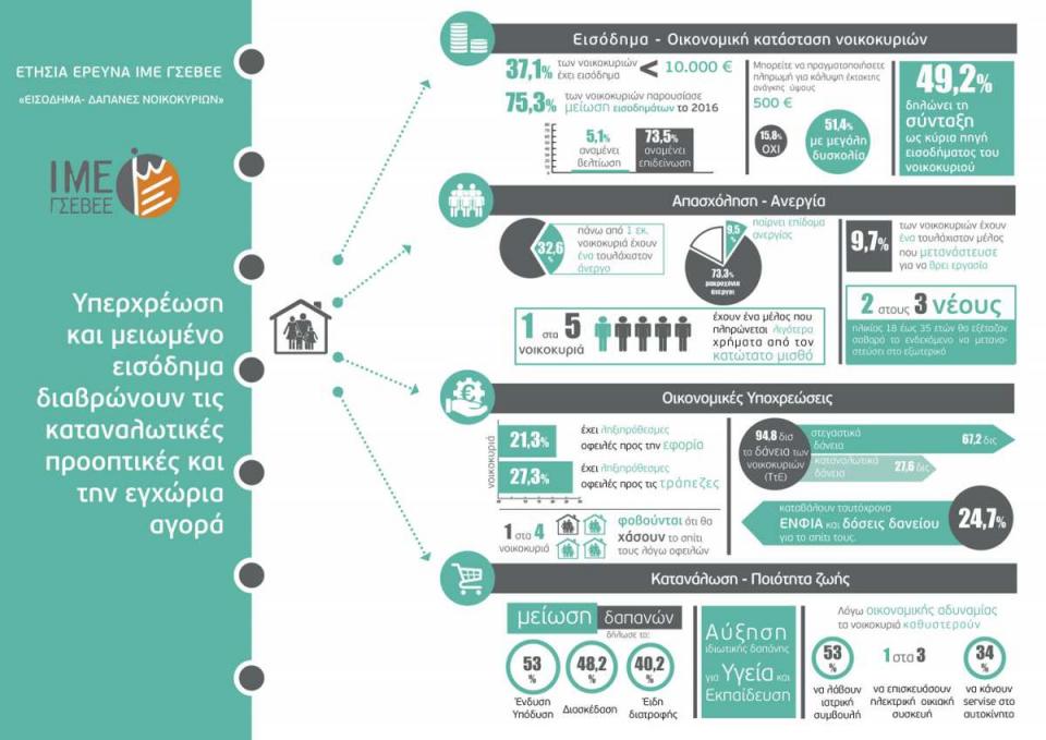 Το 75,3% των νοικοκυριών παρουσίασε μείωση των εισοδημάτων το 2016 σε σχέση με το 2015, με σαφέστατη την τάση διεύρυνσης της ανισότητας υπέρ των ανώτερων εισοδηματικών κλιμακίων (στην κατηγορία άνω των 30,000 euro παρουσιάζεται αύξηση στο 11,1% του πληθυσμού). Ιδιαίτερα ευάλωτα είναι τα μονομελή νοικοκυριά και όσα έχουν ένα άνεργο στο νοικοκυριό.