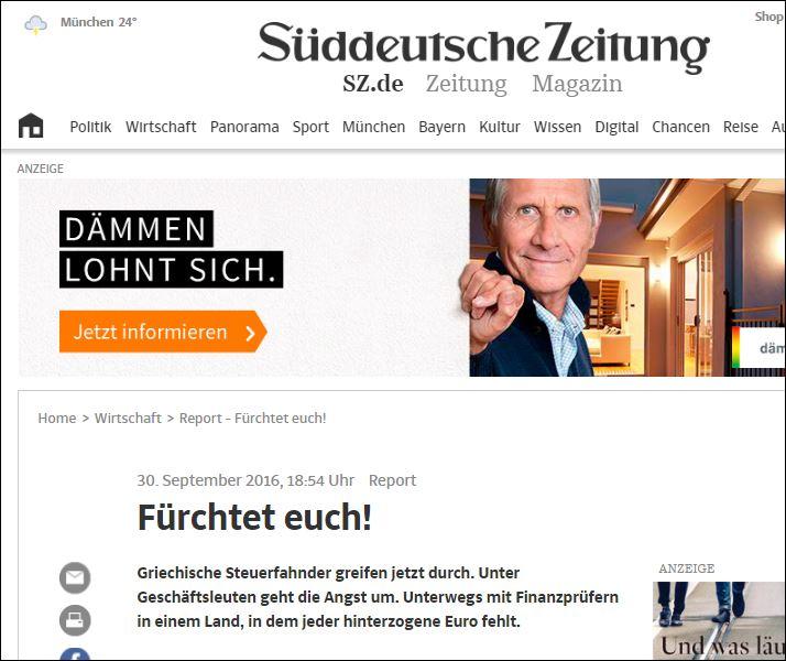 Με τον τίτλο να «Να φοβάστε!» δημοσιεύεται ρεπορτάζ στην εφημερίδα Süddeutsche Zeitung, με την πρόταση που ακούγεται σαν απειλή, να απευθύνεται στους Έλληνες φοροφυγάδες. Στο εκτενές άρθρο αναφέρονται με λεπτομέρειες οι εξελίξεις στο κυνήγι της φοροδιαφυγής στην Ελλάδα.