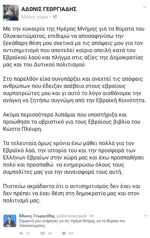 «Στο παρελθόν είχα συνυπάρξει και ανεχτεί τις απόψεις ανθρώπων που έδειξαν ασέβεια στους εβραίους συμπατριώτες μου και γι' αυτό το λόγο αισθάνομαι την ανάγκη να ζητήσω συγγνώμη από την εβραϊκή κοινότητα» αναφέρει ο κ. Γεωργιάδης, προσθέτοντας: «Ακόμα περισσότερο λυπάμαι που υποστήριξα και προώθησα το υβριστικό για τους Εβραίους βιβλίο του Κώστα Πλέυρη».