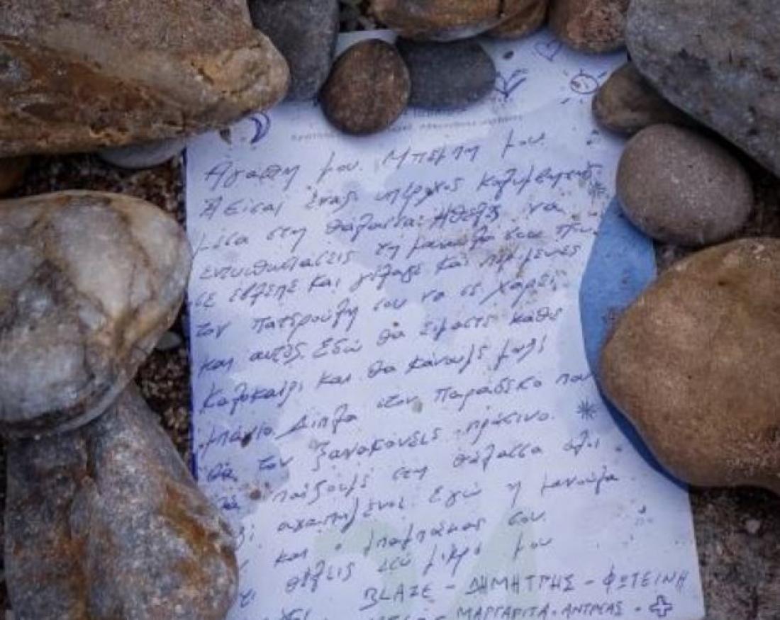 «Αγάπη μου, μπέμπη μου, είσαι ένας υπέροχος κολυμβητής μέσα στη θάλασσα. Ήθελες να εντυπωσιάσεις τη μανούλα σου, όπως κάθε φορά που σε έβλεπε και την έκανες χαρούμενη, όπως και περίμενες τον πατερούλη σου να σε χαρεί. Εδώ θα είμαστε κάθε καλοκαίρι και θα κάνουμε μαζί μπάνιο, δίπλα στον παράδεισο που θα τον ξανακάνεις πράσινο. Θα παίζουμε στη θάλασσα όλοι μαζί κι αγαπημένοι. Εγώ, η μανούλα σου και ο μπαμπάκας σου. Ότι θέλεις εσύ, μικρό μου ψαράκι. Δημήτρης, Φωτεινή, Μαργαρίτα, Ανδρέας».