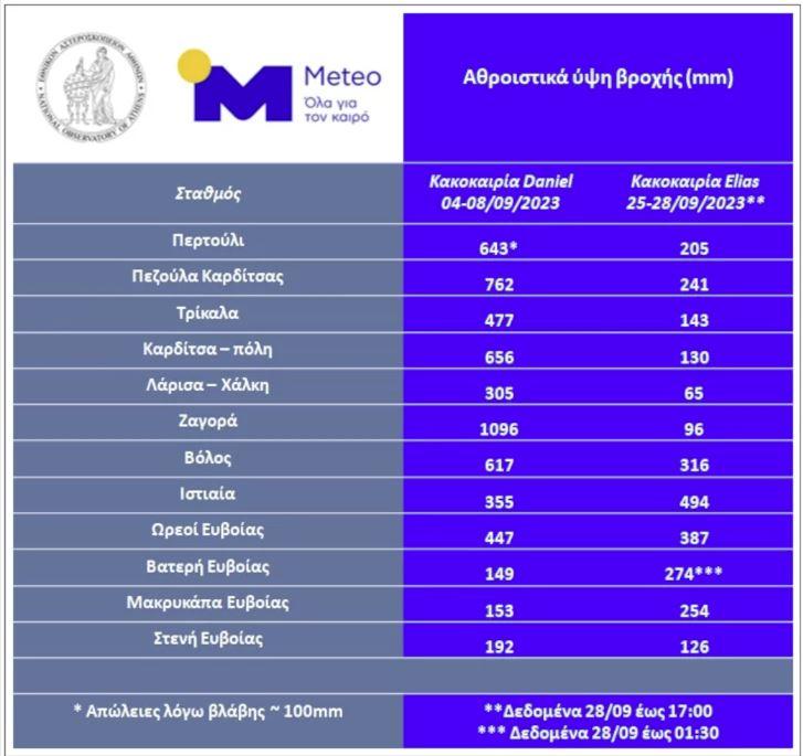 Τα ύψη βροχής που καταγράφηκαν κατά την κακοκαιρία Daniel ήταν μεγαλύτερα στη Θεσσαλία, ενώ στην Εύβοια (με εξαίρεση τους σταθμούς σε Ωρεούς και Στενή) τα ύψη βροχής της κακοκαιρίας Elias ήταν μεγαλύτερα.
