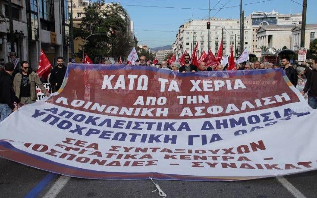 Με κεντρικό σύνθημα «Κάτω τα χέρια από την Κοινωνική Ασφάλιση» ολοκληρώθηκε το συλλαλητήριο εργαζομένων, αυτοαπασχολουμένων, συνταξιούχων στην Βουλή. Νωρίτερα η συγκέντρωση στα Προπύλαια άνοιξε με χαιρετισμό του Ολιβιέ Ματό, γγ του Εργατικού Κέντρου Μασσαλίας, ο οποίος εξέφρασε την ταξική αλληλεγγύη και τη στήριξη των εργαζομένων του νομού και της πόλης της Μασσαλίας.