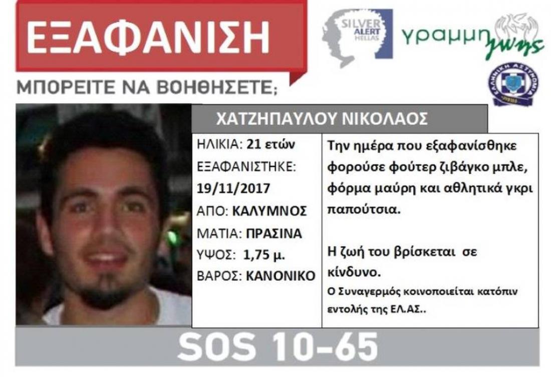 Σύμφωνα με τη Γραμμή Ζωής, η οποία εξέδωσε Silver Alert, πρόκειται για τον Νικόλαο Χατζηπαύλου. Την ημέρα που εξαφανίστηκε φορούσε φούτερ ζιβάγκο μπλε, μαύρη φόρμα και αθλητικά γκρι παπούτσια. Έχει πράσινα μάτια, ύψος 1,75 μ. και κανονικό βάρος.